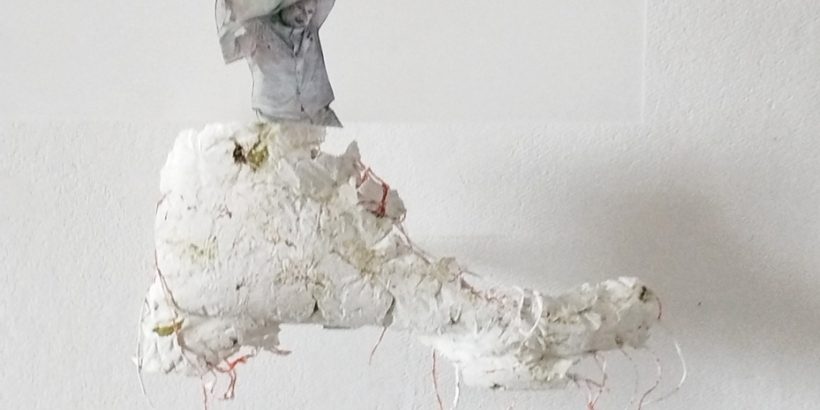 Sloma, 2019 argile et foin Crédit photo : Guy L’Heureux Chapesco, 2018 argile, fibres, papier, tissu avec support métal/béton Crédit photo : Guy L’Heureux Je construis du temps par fragments. Avec cette matière trouvée, je rêve, dessine, sculpte. Enfant fulgurée par le regard d’un peinte, ami de mon père. Comme la cible peinte au centre…