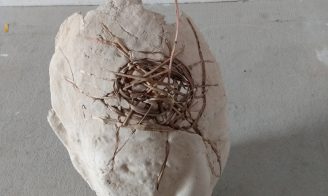 Le fil de papier, façonné en réseaux, est le narrateur de l’installation Au cœur du plus vieil arbre du monde. Des traces de pas encerclent un couple, bottes et escarpins, qui ont été métamorphosés par l’enchantement du lieu. Par leurs traces végétales, ce rassemblement d’hommes et de femmes a pris racine et fait à présent…
